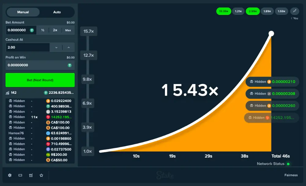 No modo manual, o jogador define o valor da aposta e o multiplicador em que quer sacar. Tudo é bem simples.